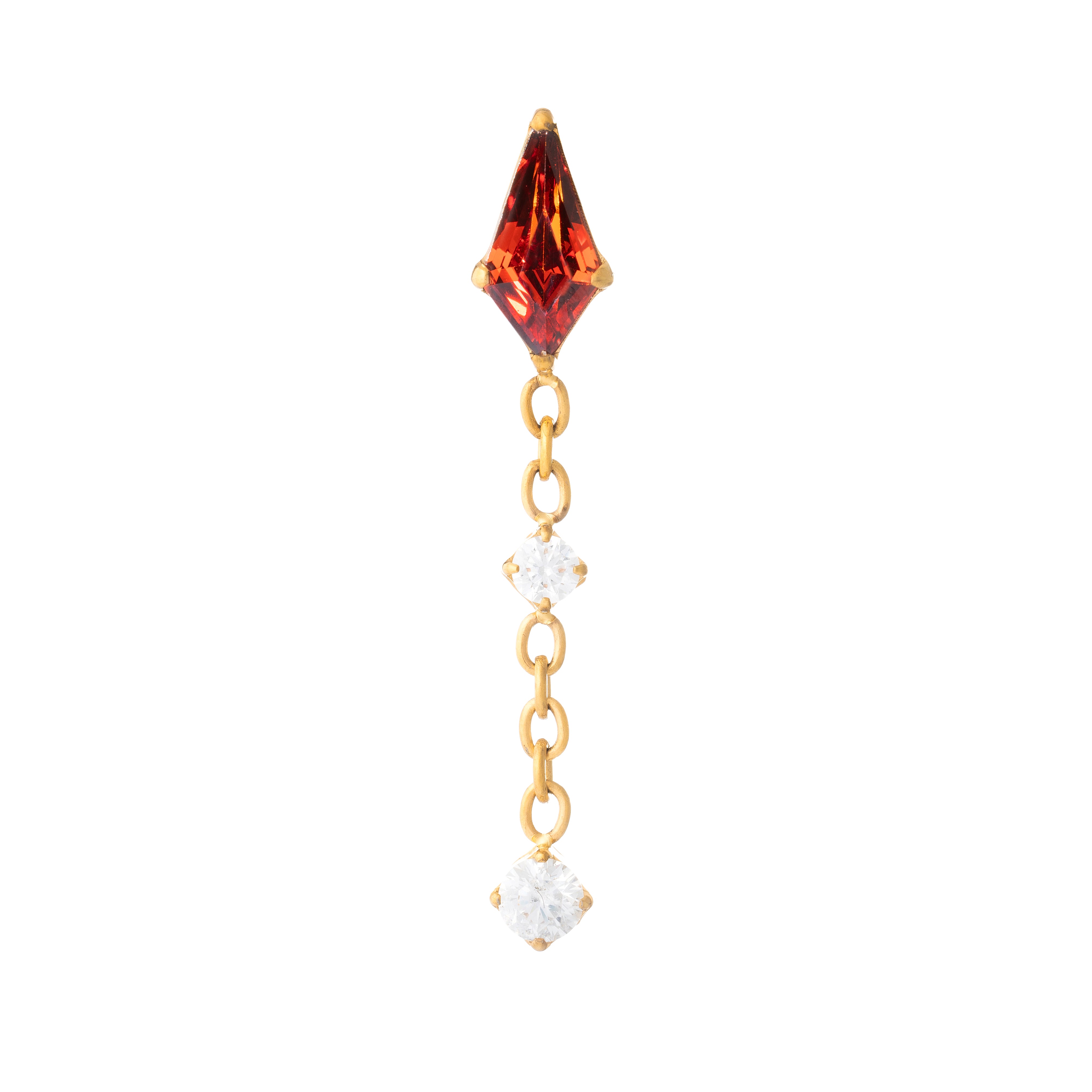 Just like a pendulum, this implant-grade titanium end is here to give eternal movement to your ear curations. A vibrant red kite-cut cubic zirconia stone is the star of the show on the top, with a beautiful 24K gold plated chain hanging from the bottom. The chain is adorned with clear, round cubic zirconias. Our Pendulum End is part of the Bloodline Collection.