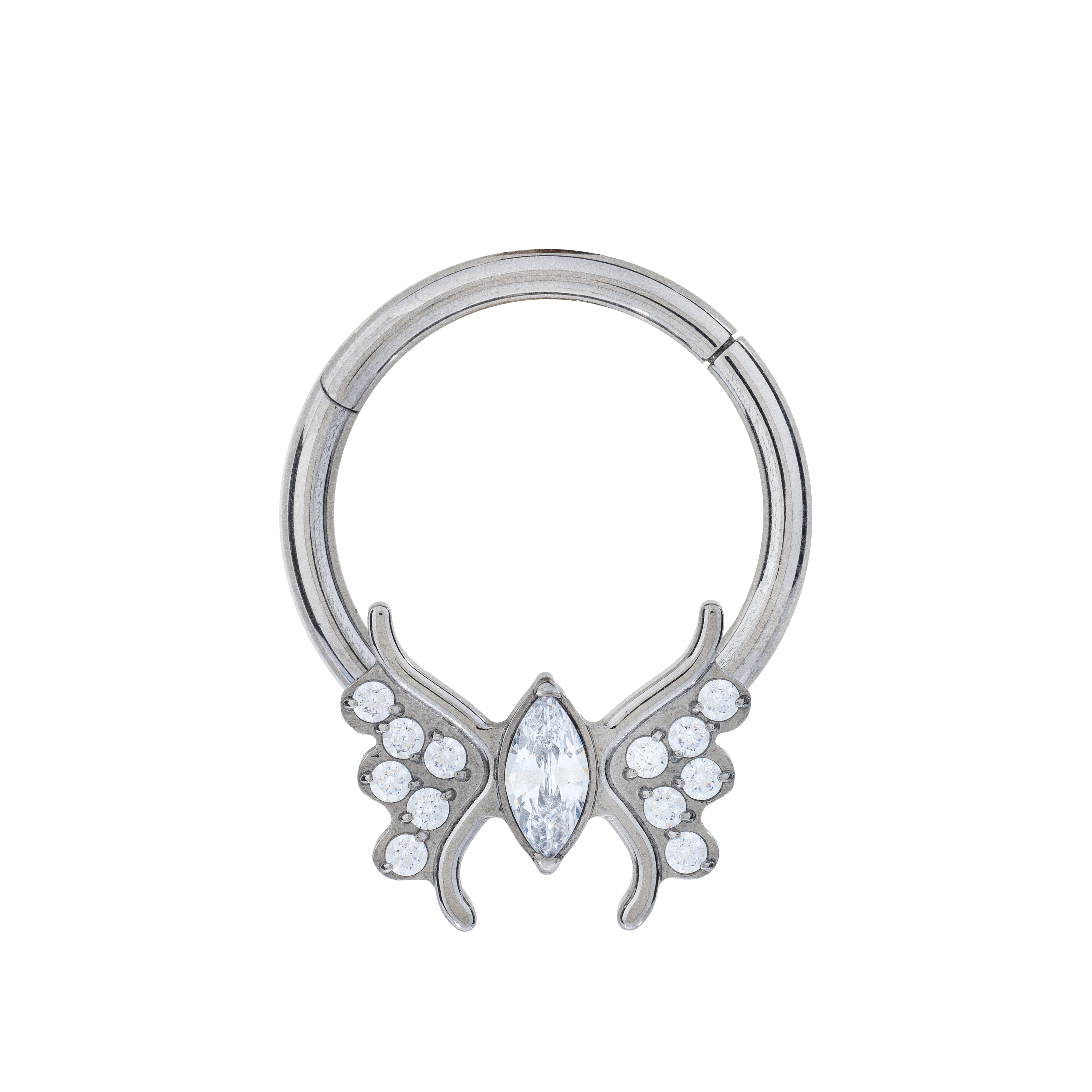 This clicker is composed of a butterfly with a marquise-cut cubic zirconia stone body, and wings paved with small shimmering cubic zirconia stones.