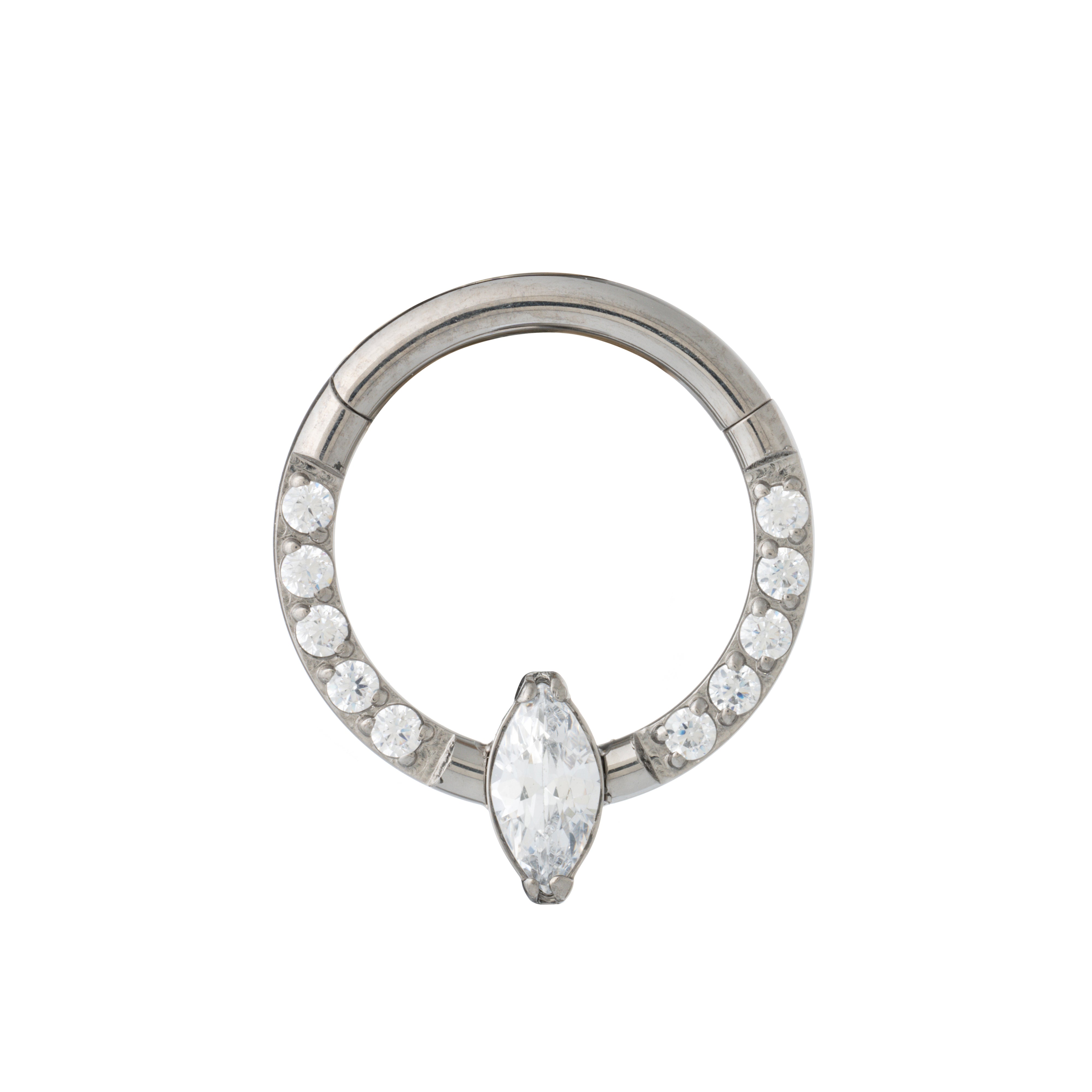 The Seraphyne Clicker is an implant-grade titanium ring paved with cubic zirconia stones and featuring a bold single marquise stone in the center.