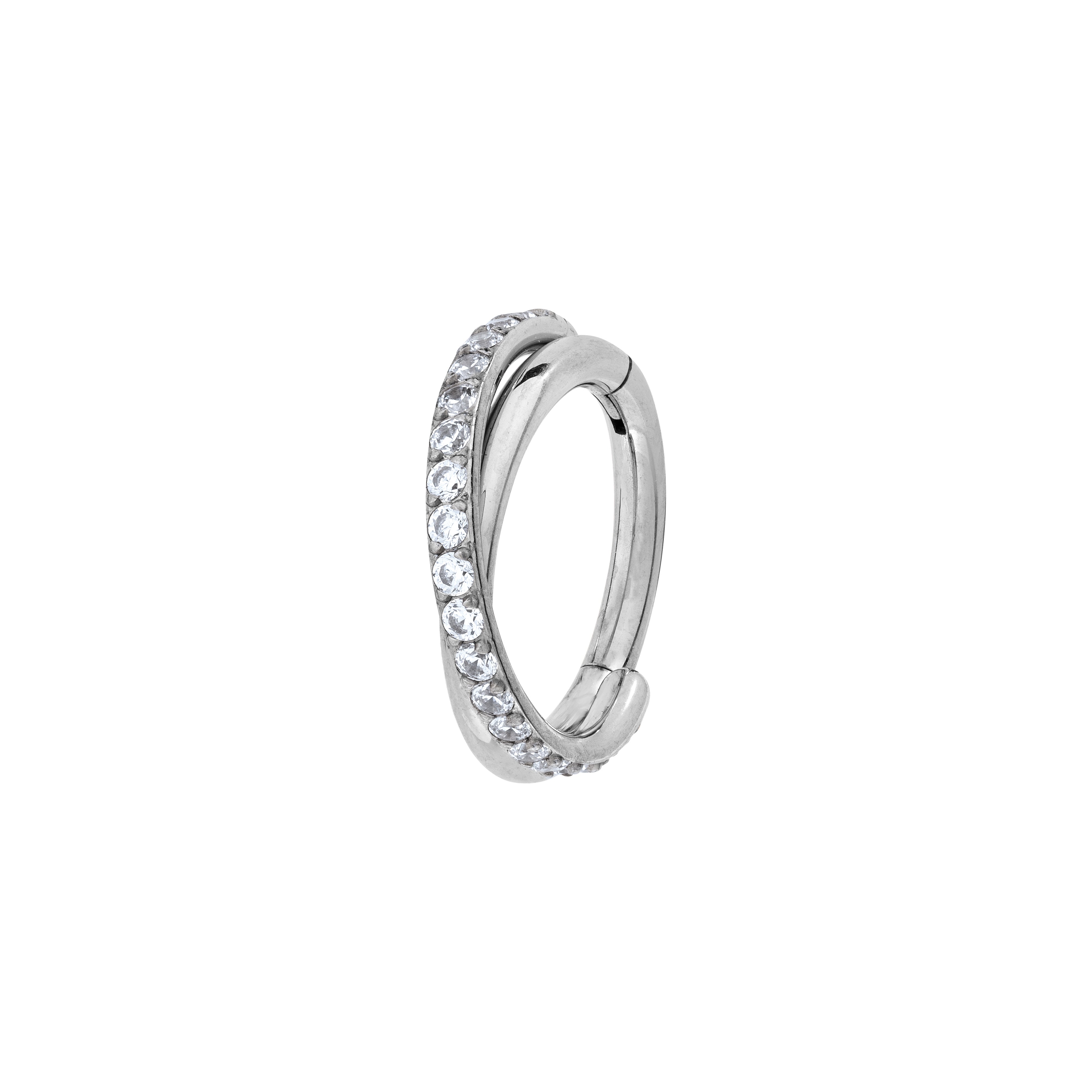 This implant-grade titanium clicker ring features two intertwined rows, one paved with premium cubic zirconia stones and one plain.