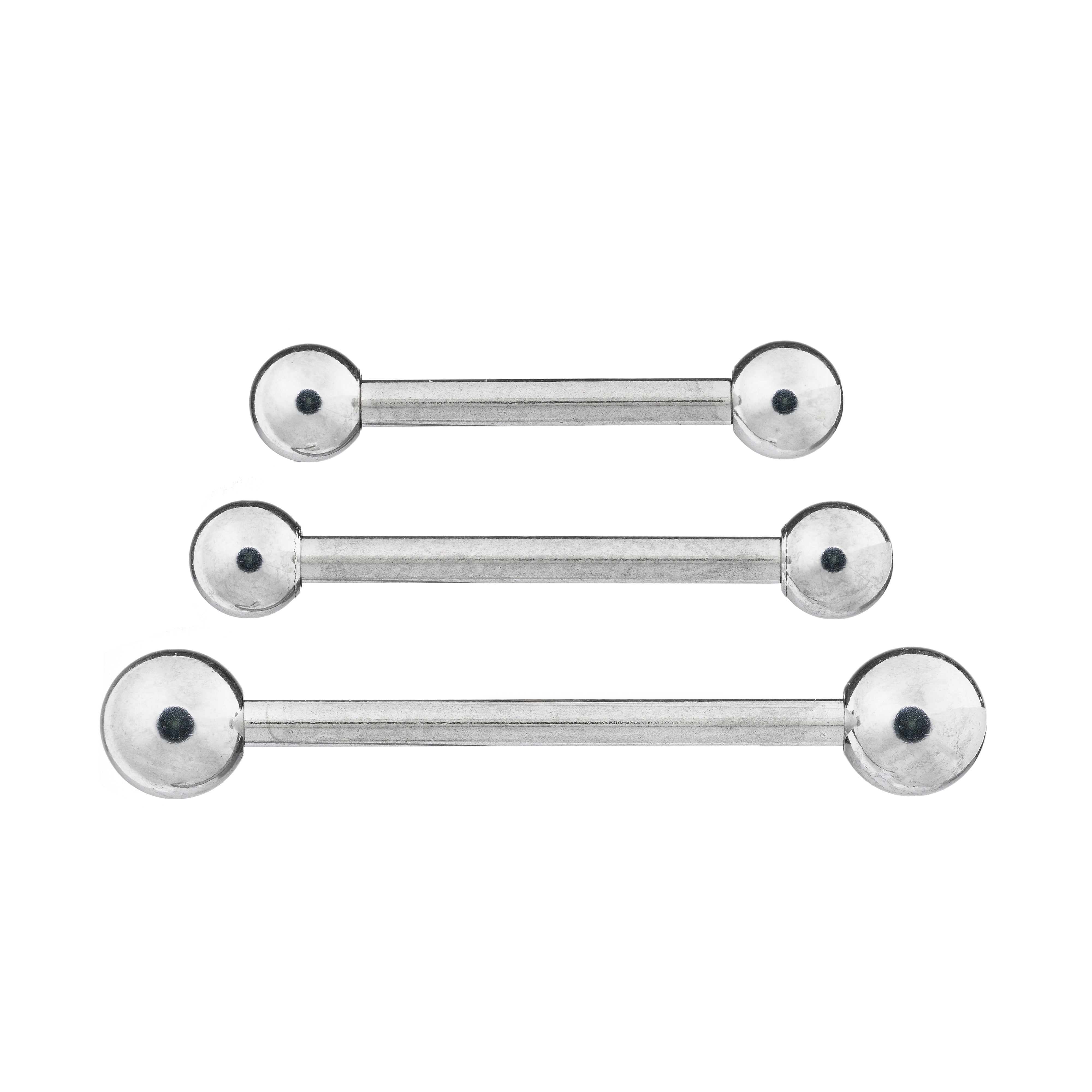 Implant-grade titanium barbell, polished to perfection. Available with 3mm, 4mm or 5mm ball on each side, depending on length.