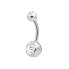 This classic internally threaded navel banana features a 5mm top & 8mm bottom round ball with cubic zirconia. The jewels are press-fit with a slight bezel and safely secured in place. Ideal for initial navel piercings.