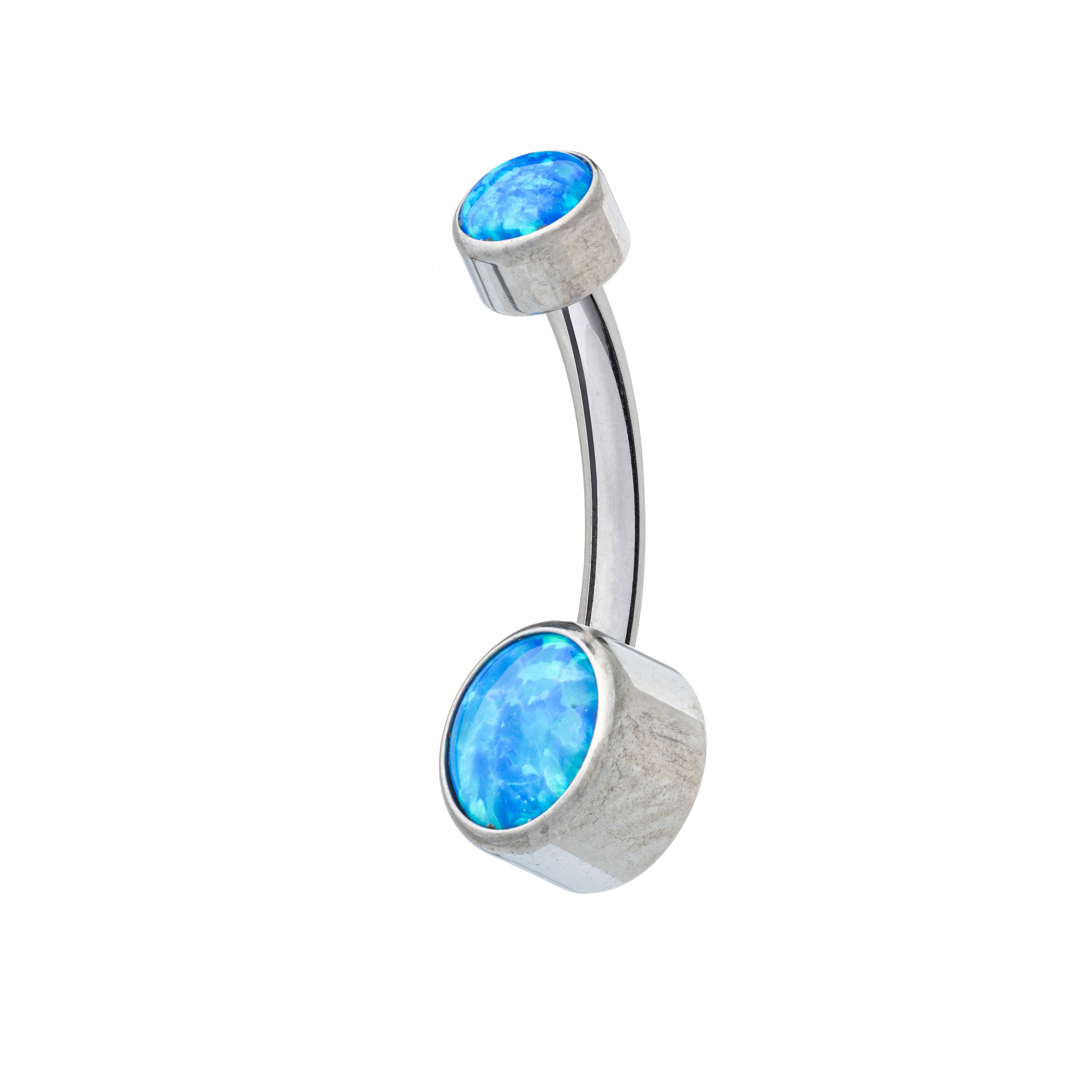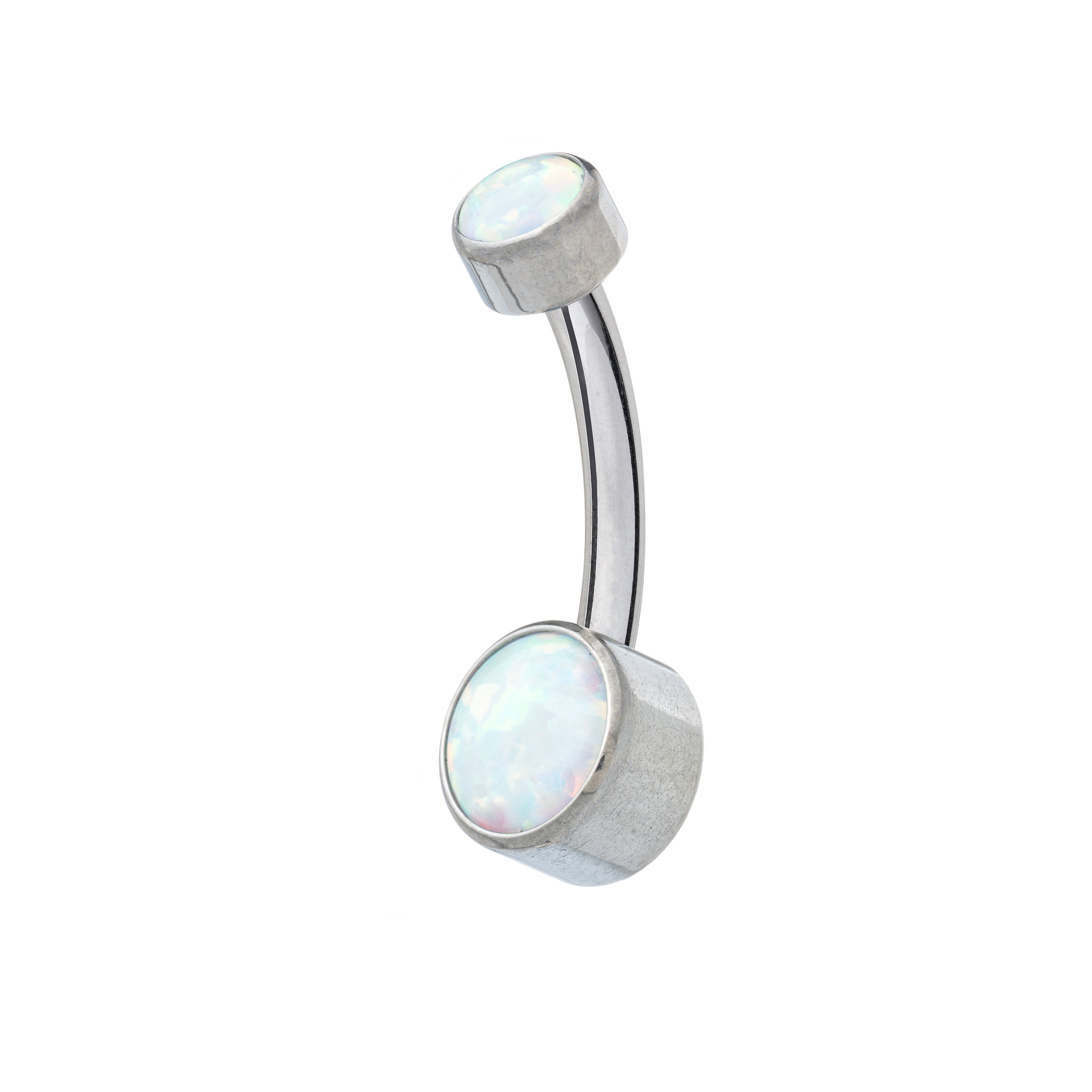 This navel banana features 5mm and 8mm round, bezel-set opal stones on the top and bottom, respectively. The stones feature a completely flat back for comfortable wear. Available in stunning blue opal or a dreamy white.