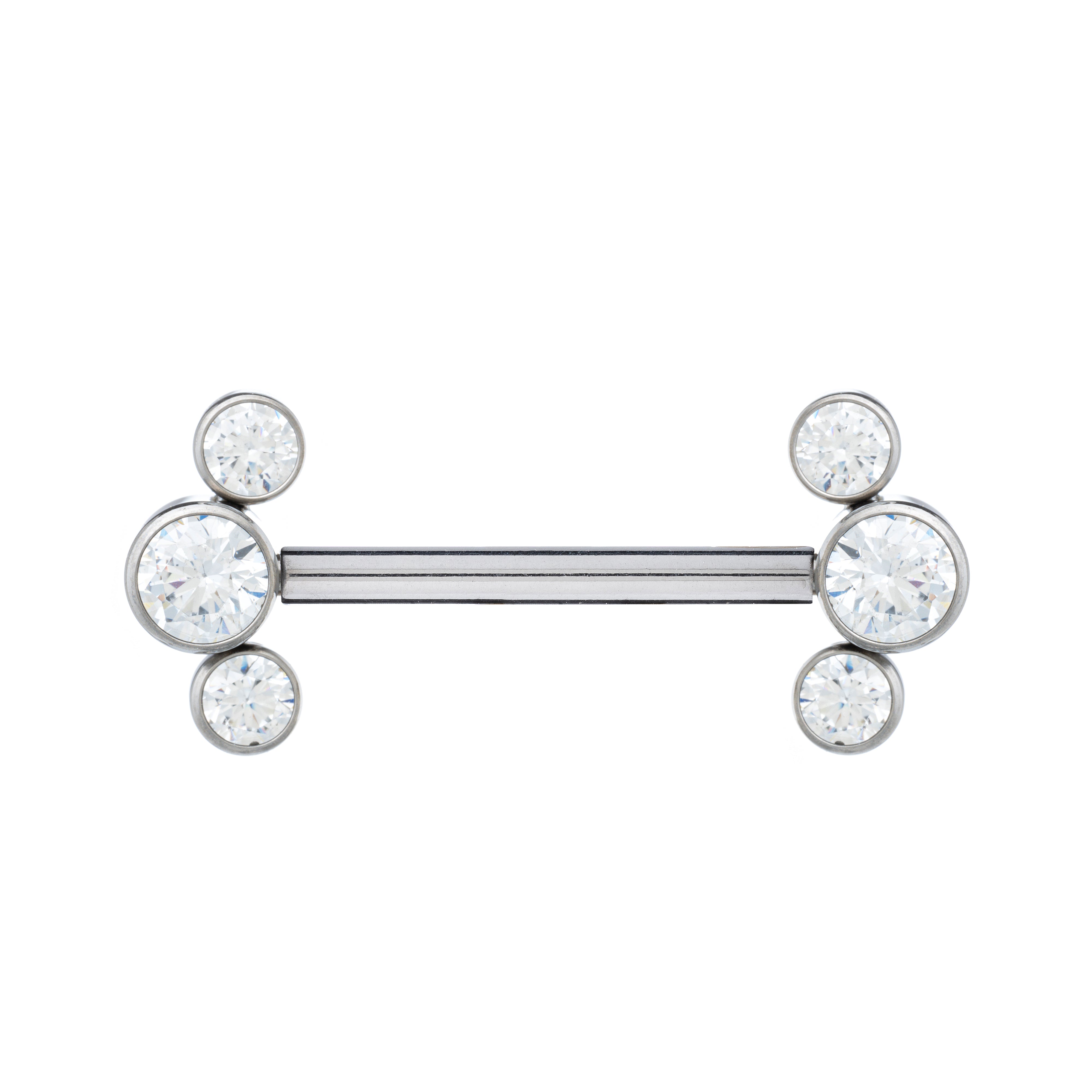 The Bling Trio Nipple Barbell features three round, bezel-set cubic zirconia stones on each side, sized 3mm, 4mm, 3mm.