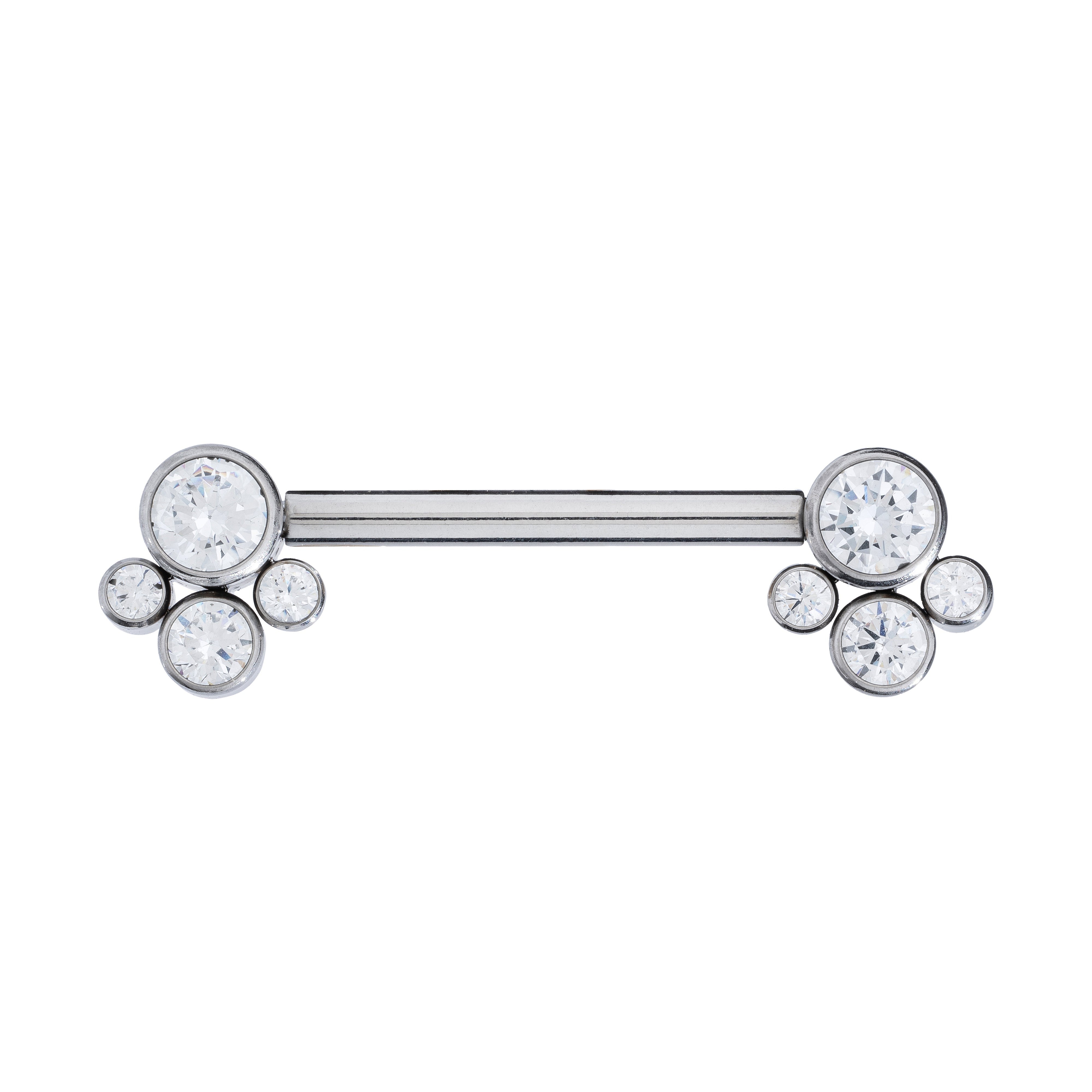 The Quadra Nipple Barbell has two main stones, sized 4mm, embellished with three smaller round cubic zirconia stones sized 2mm, 3mm and 2mm. All stones are bezel-set, flat-back and polished to perfection for comfortable everyday wear.