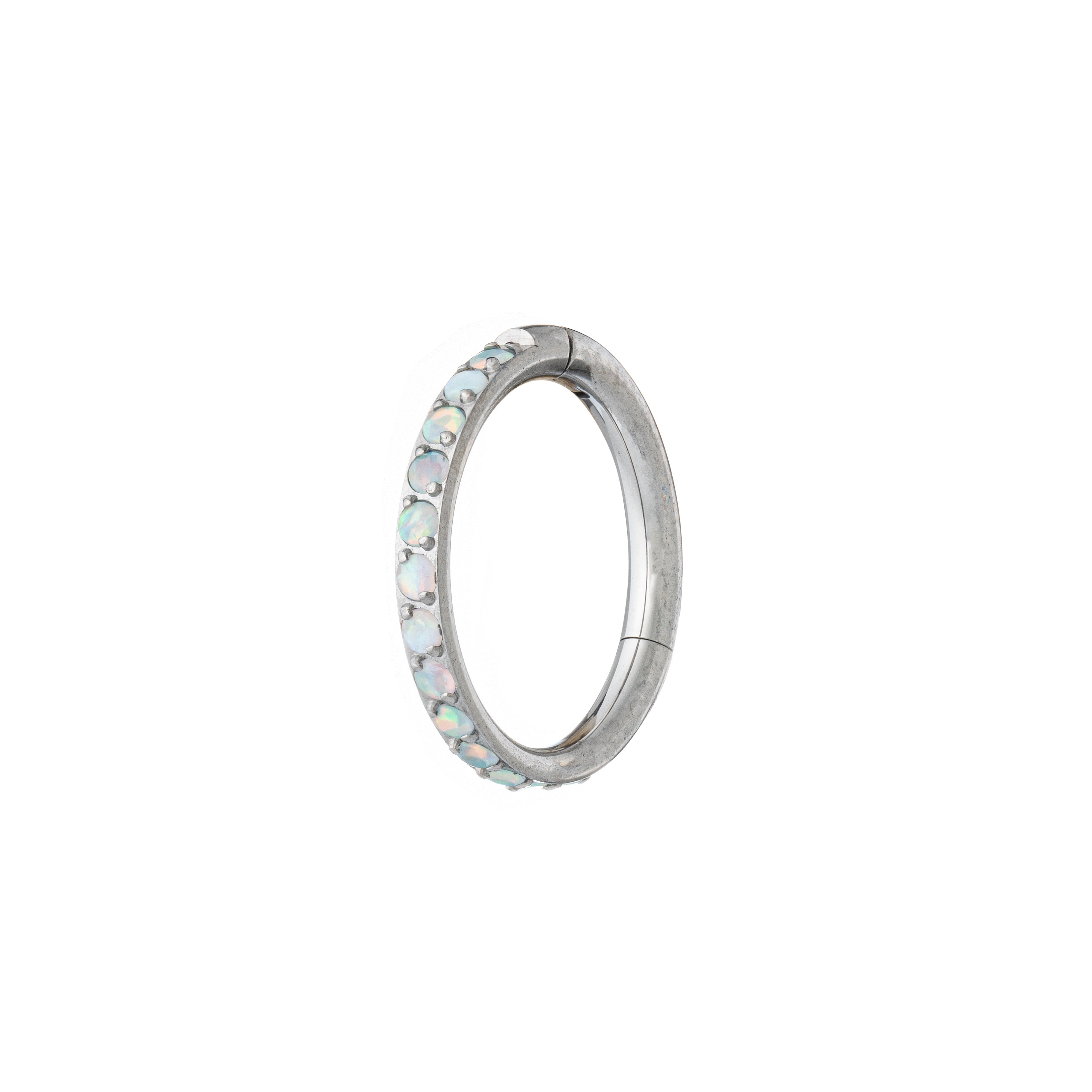 This implant-grade titanium clicker ring is adorned with a row of tiny pave, lab-grown opal stones. The gemstones are side facing, making this clicker a very versatile piece.