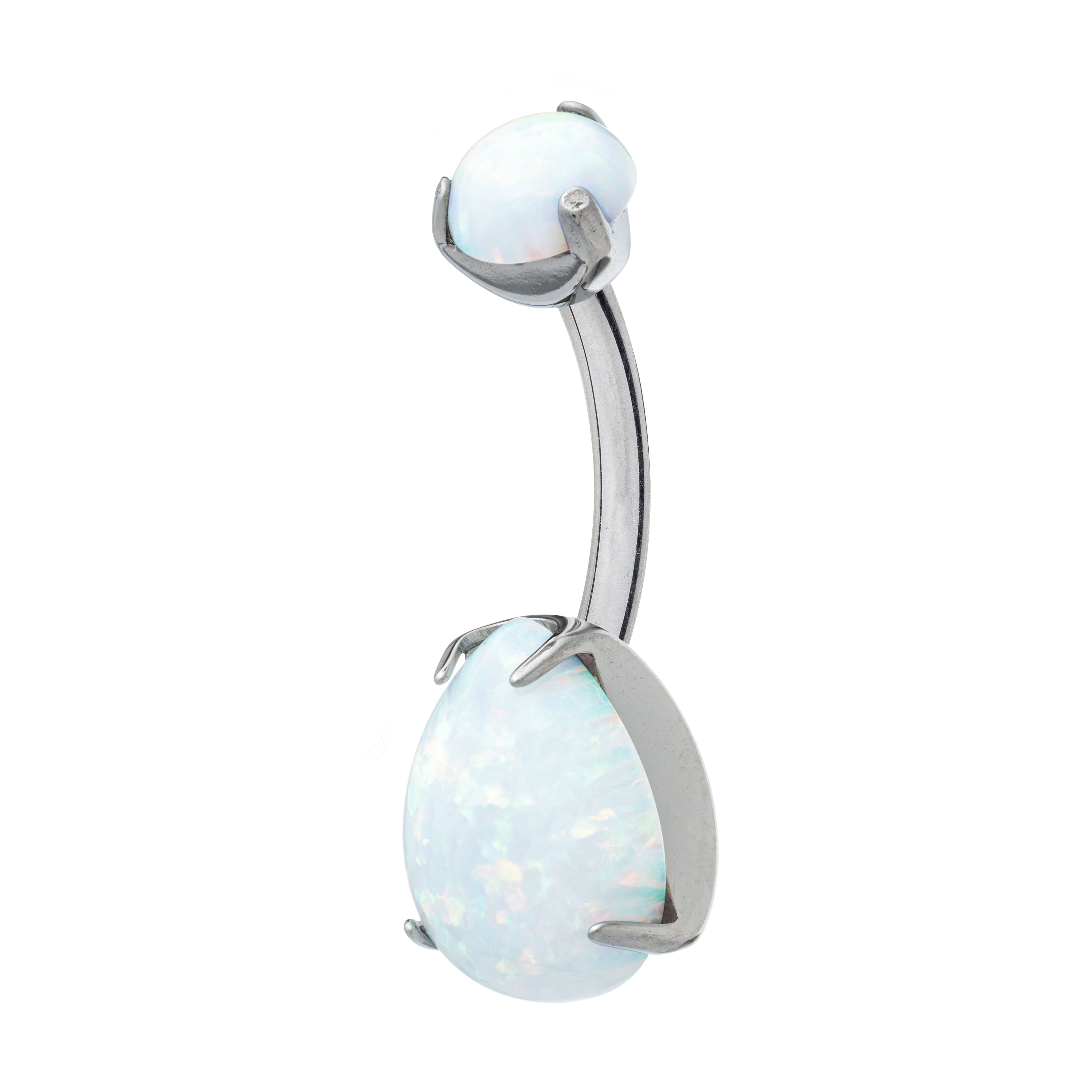 This Pear Opalium Navel Banana features a 5mm, round prong-set opal stone on the top, and an 8mm prong-set, pear-cut opal stone on the bottom.