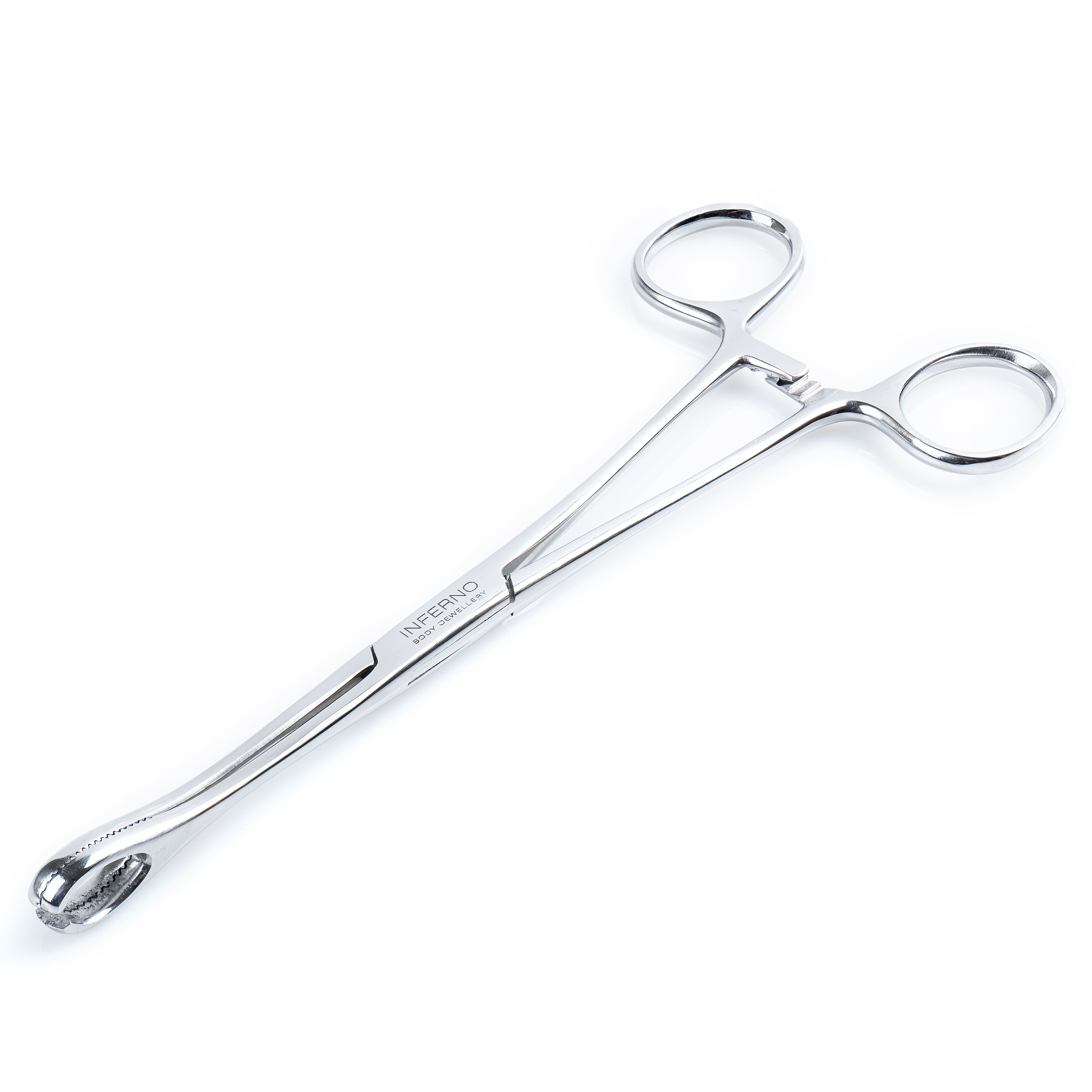 This tool is the slotted version of the classic standard forester forceps. They feature a round, textured tip with a small opening in the middle that allows for secure holding of the skin during the piercing procedure. They are crafted from high quality surgical steel and are resistant to corrosion and rust.