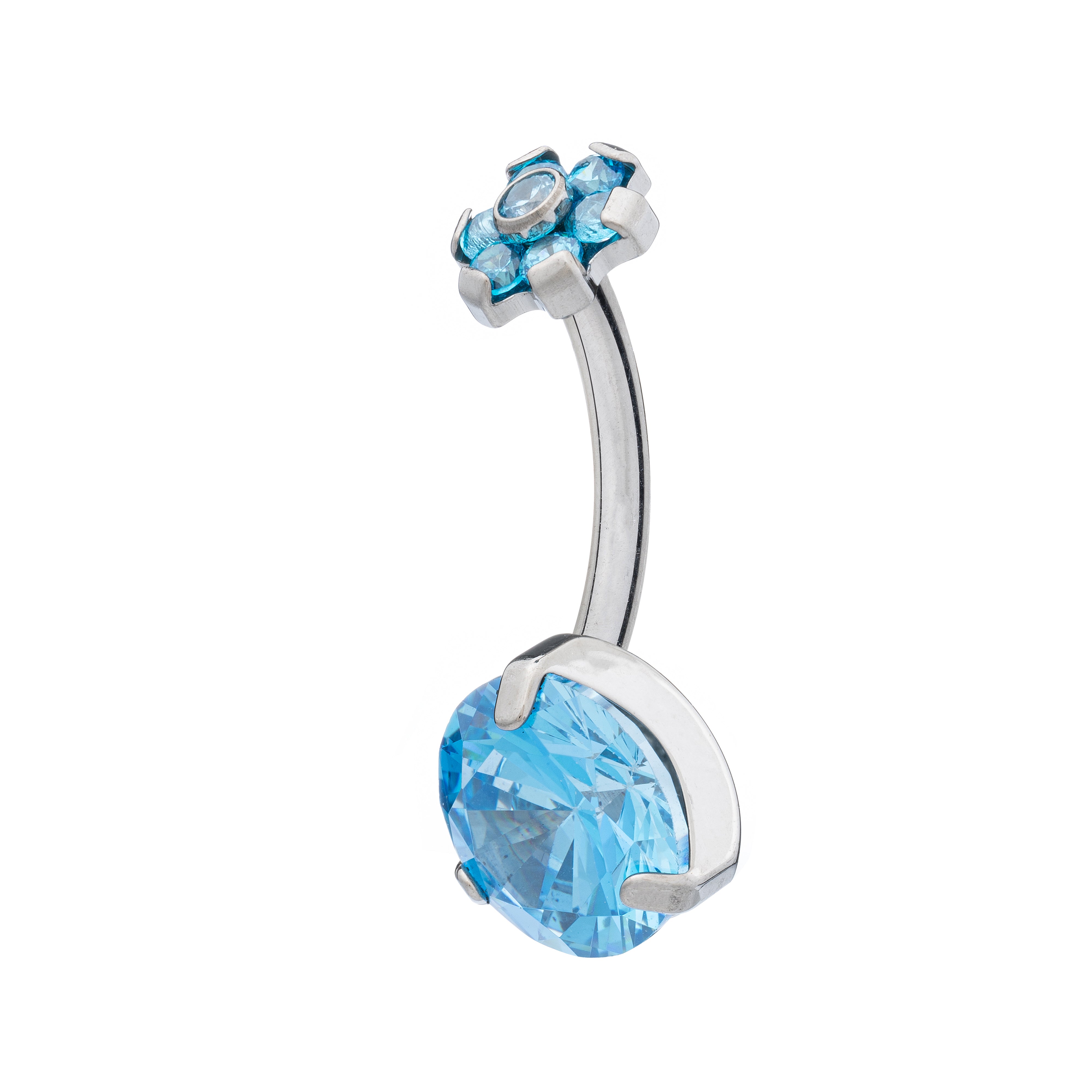 This playful navel banana features a 5mm prong-set cubic zirconia daisy top & an 8mm prong-set round zirconia stone on the bottom.