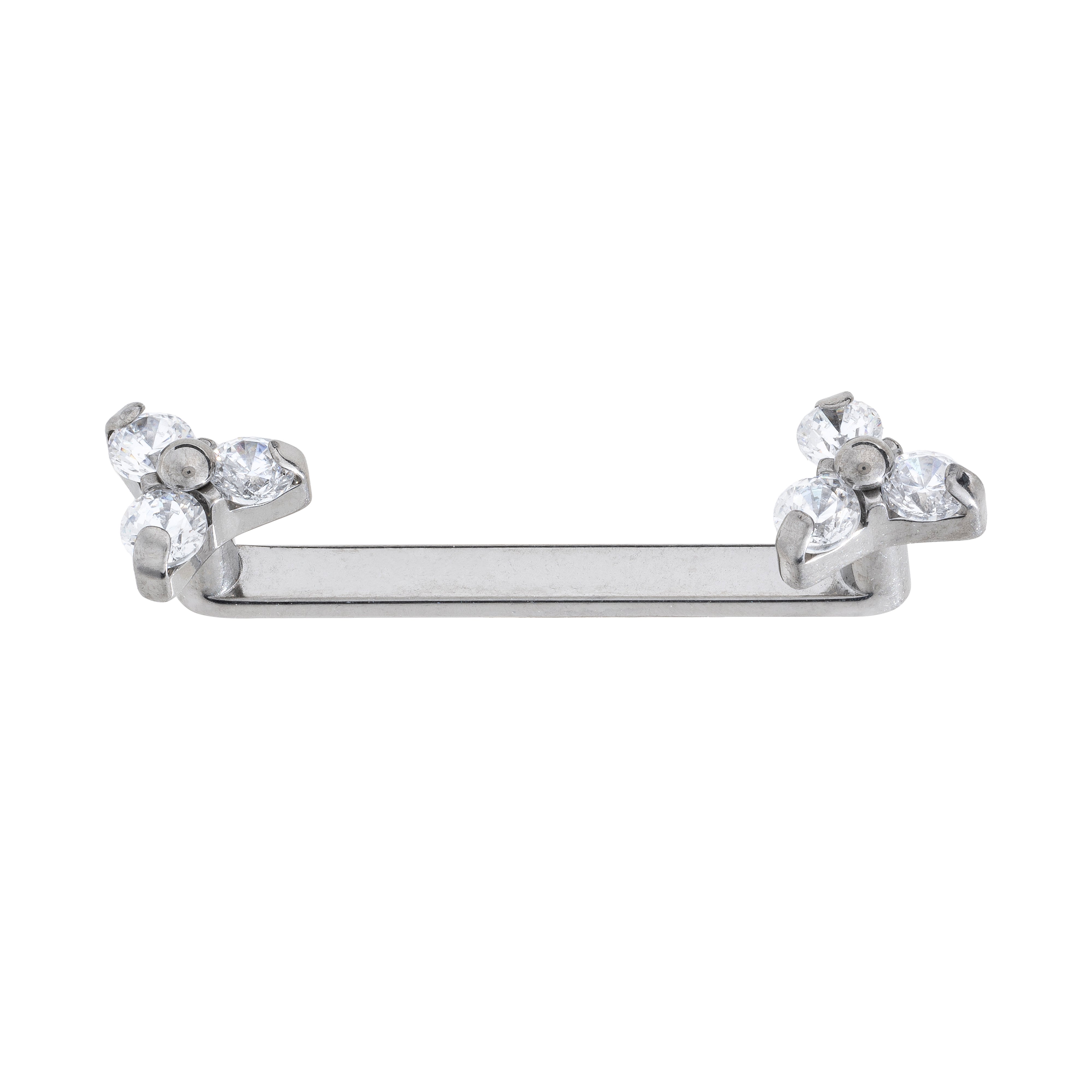 Implant-grade titanium flat surface bar featuring a trinity of prong-set cubic zirconia stones on each side with an 0.9mm internal thread.