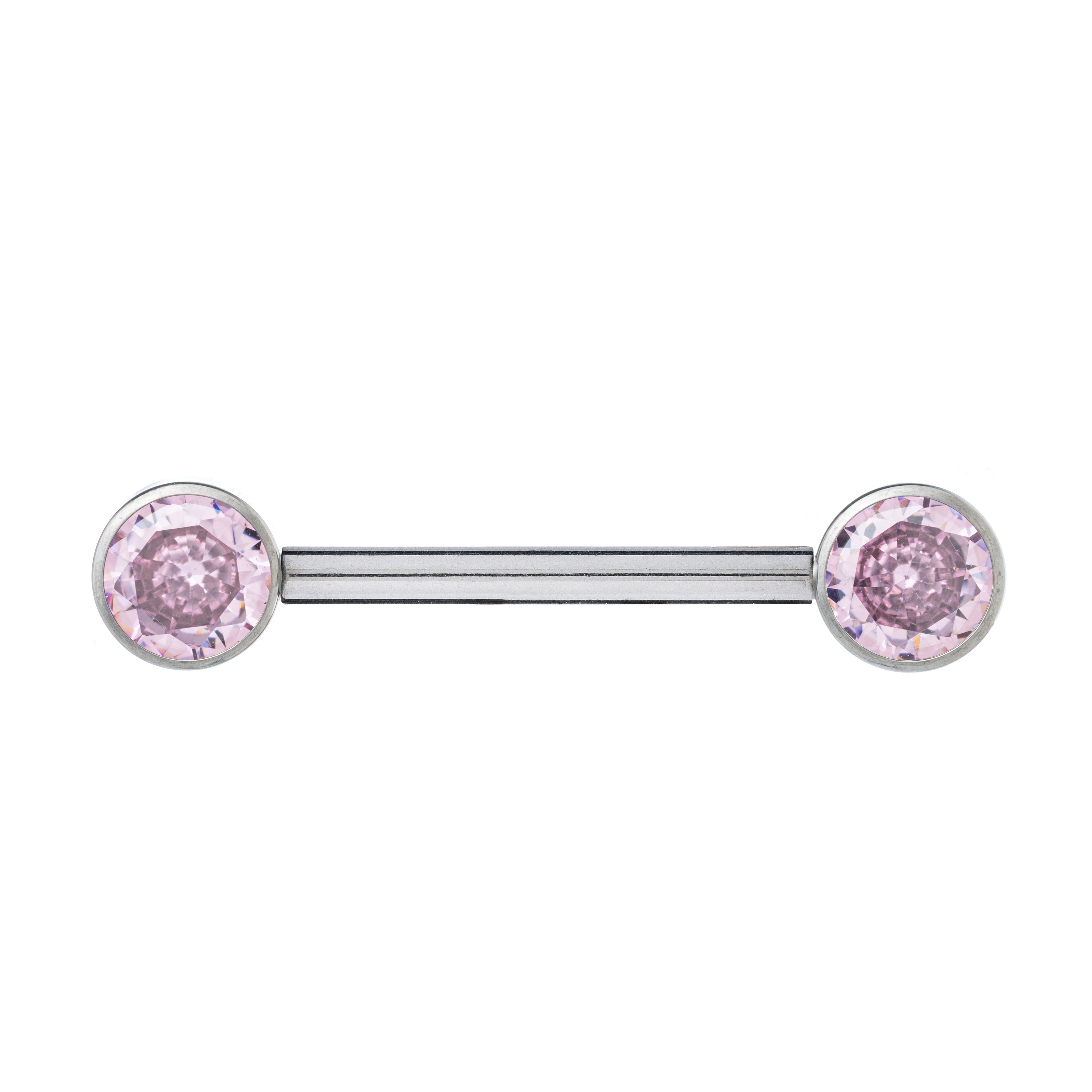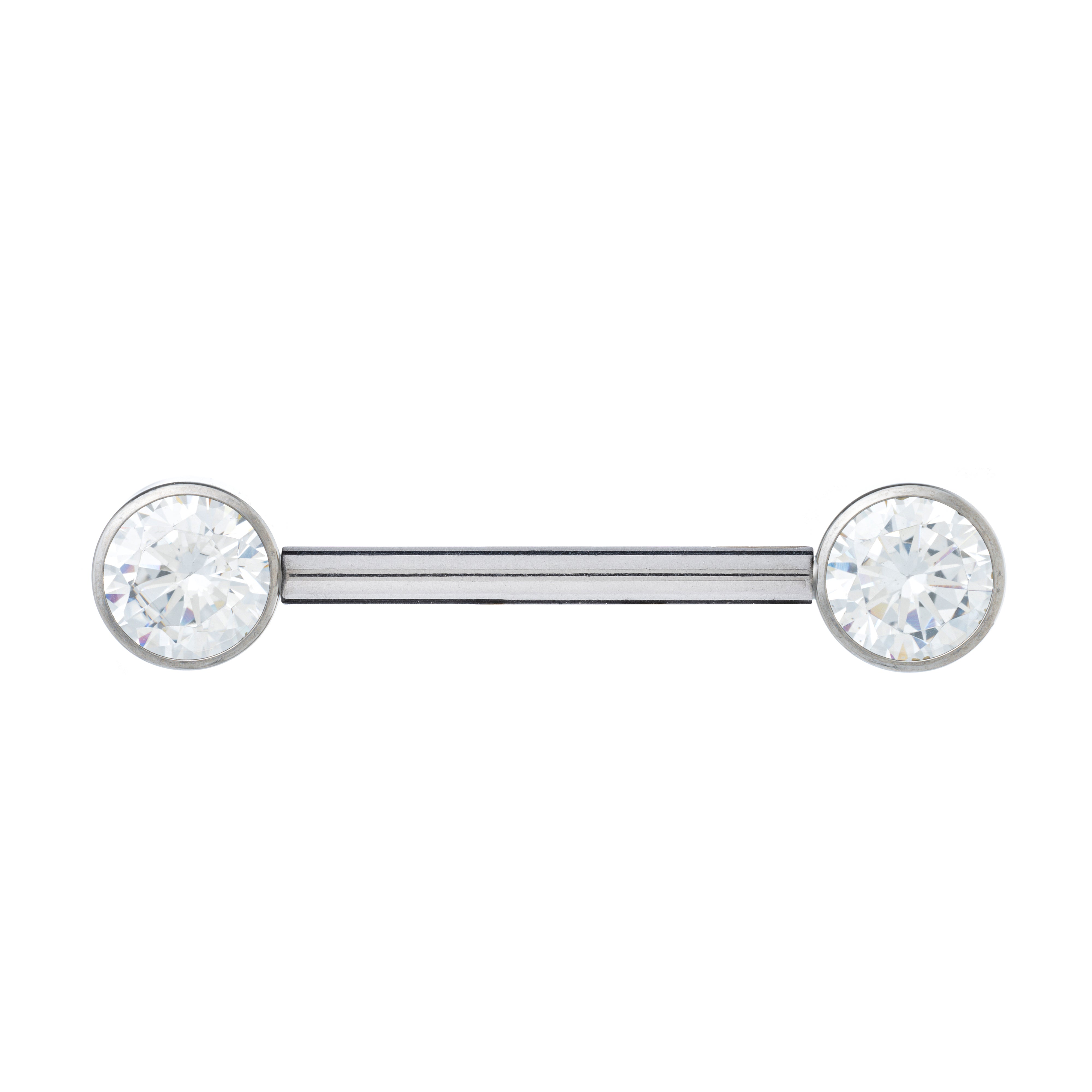 This nipple barbell features two round flat-back, bezel-set cubic zirconia stones, sized 5mm. Available in two stunning colours.