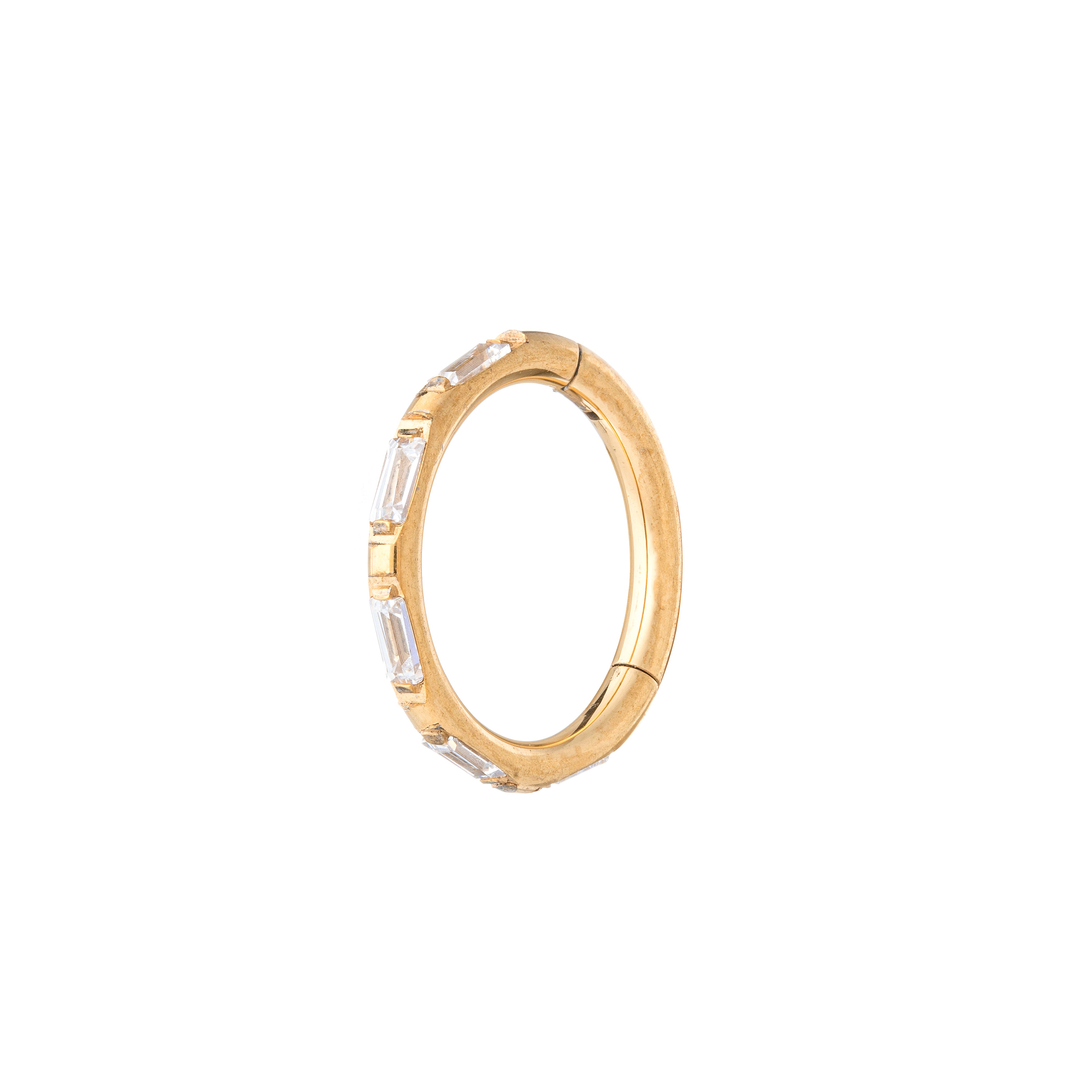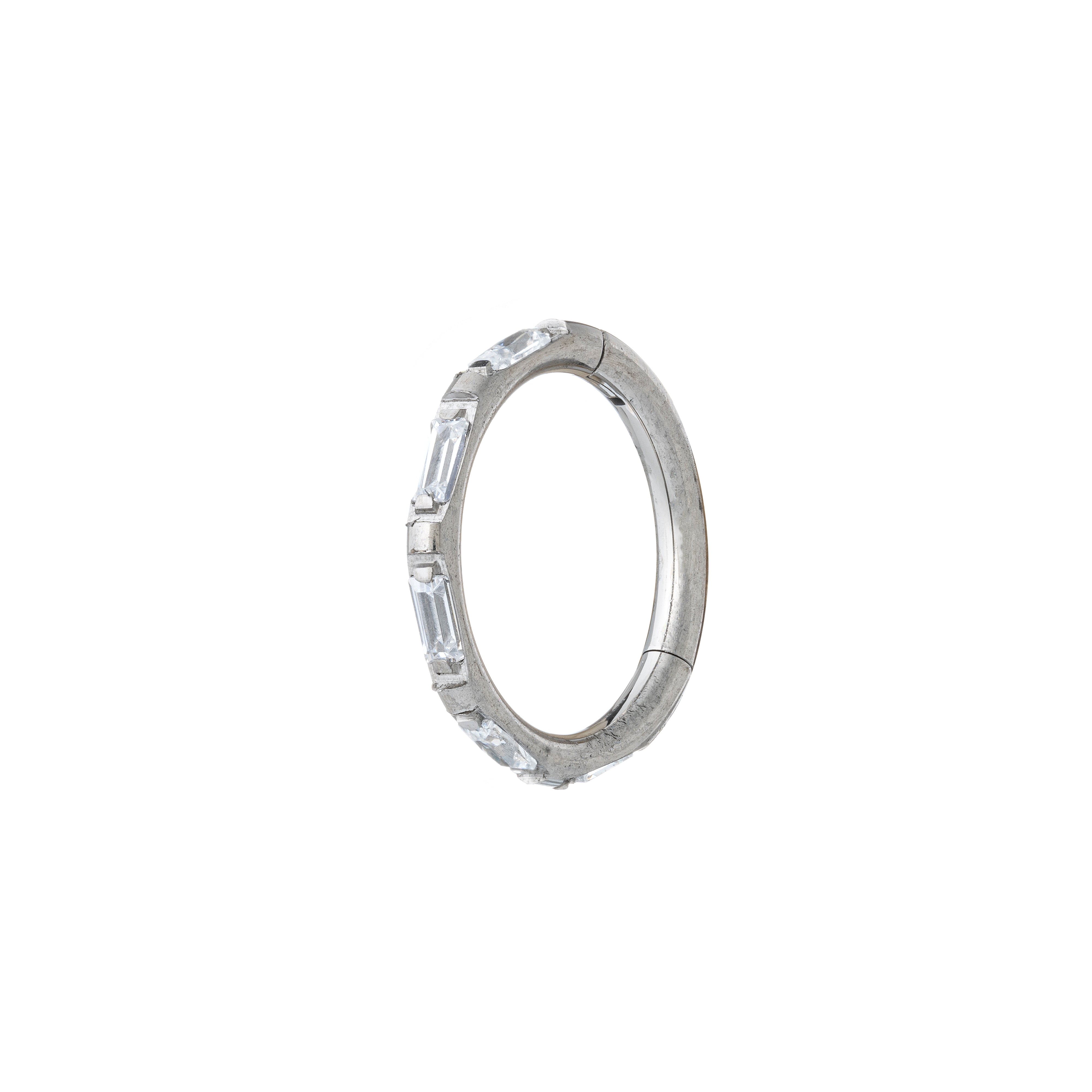 This implant-grade titanium clicker is decorated with premium oblong-cut cubic zirconia stones, facing the side.